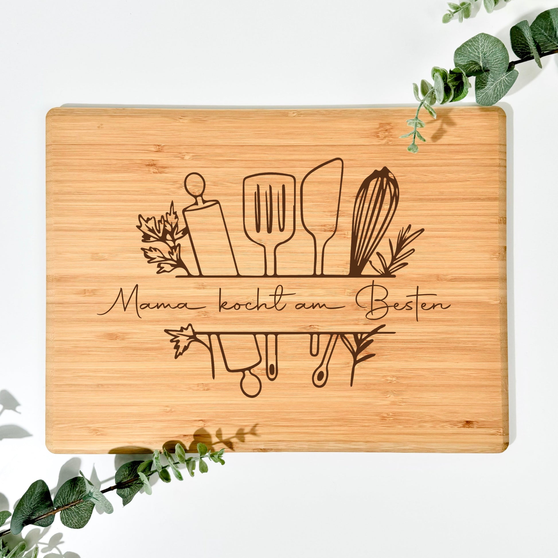 Verschönere deine Küche mit einem Schneidebrett aus edlem, geräuchertem Bambus. Die einzigartige Holzoptik wird durch eine ansprechende Küchengrafik bereichert. Individuell anpassbar mit einem Namen oder einem liebevollen Spruch wie „Papa kocht am besten", wird dieses Schneidebrett zu einer persönlichen Kochinspiration.